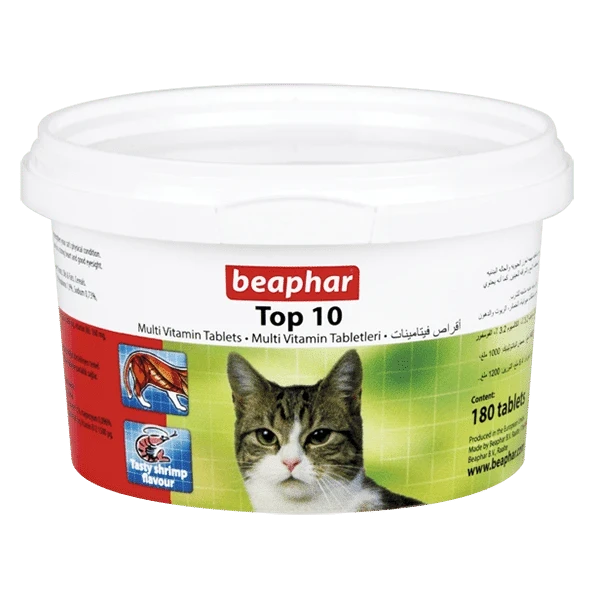 Beaphar Top 10 قرصهای مولتی ویتامین بسیار خوش طعم، با کاربرد آسان، برای گربهها، با طعم میگوی خوش طعم هستند. Beaphar Top 10 حاوی 10 ویتامین، از جمله ویتامین A، B، D و E، برای حمایت از سلامت مطلوب، تقویت سرزندگی و پوششی براق، و مواد معدنی ضروری برای حمایت از رشد طبیعی استخوان ها و دندان ها است. علاوه بر این، Beaphar Top 10 حاوی تورین اضافه شده برای حمایت از عملکرد چشم و قلب است. مناسب برای تمامی نژادهای گربه.