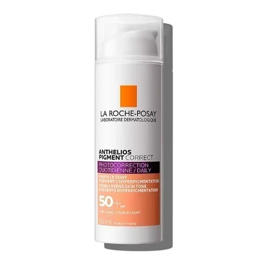 کرم ضد آفتاب رنگی +SPF50 آنتلیوس پیگمنت کارکت لاروش پوزای (La Roche-Posay Anthelios Pigment Correct Cream SPF50+ Medium) یک ضد آفتاب رنگی روزانه است که محافظت بسیار بالایی در برابر آفتاب دارد و ظاهر پوست را یکدست می کند. این ضد آفتاب مخصوص کسانی است که با لکه های تیره و هایپرپیگمانتاسیون دست و پنجه نرم می کنند. ضدآفتاب پیگمنت کارکت لاروش پوزای ترکیبی از فیلترهای موثر آفتاب و مواد فعال ضد تیرگی قوی با فرمول رنگی است که پوست را پوشش دهی می کند و آنرا فوراً یکدست می کند. با داشتن +SPF50 و PPD 39، این ضد آفتاب یک مکمل عالی برای هر روتین مراقبت از پوست ضد لکه های تیره است.