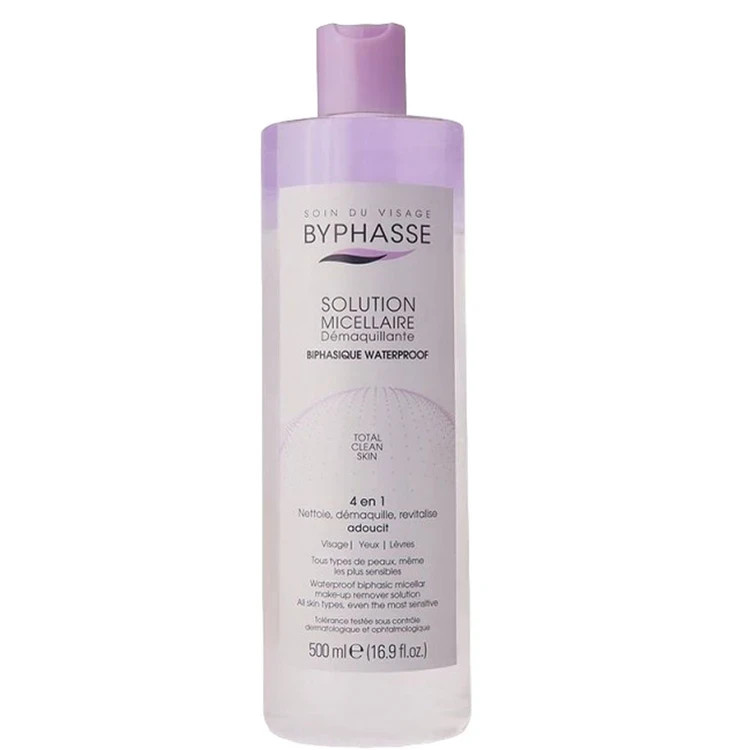 محلول میسلار دوفازی ضد آب BYPHASSE یک آب پاک کننده است که قدرت میسل ها (ذرات کوچک سورفکتانت) و روغن را ترکیب می کند و با آن بدون فشار و آسیب ذرات میکاپ را از روی پوست برمیدارد.