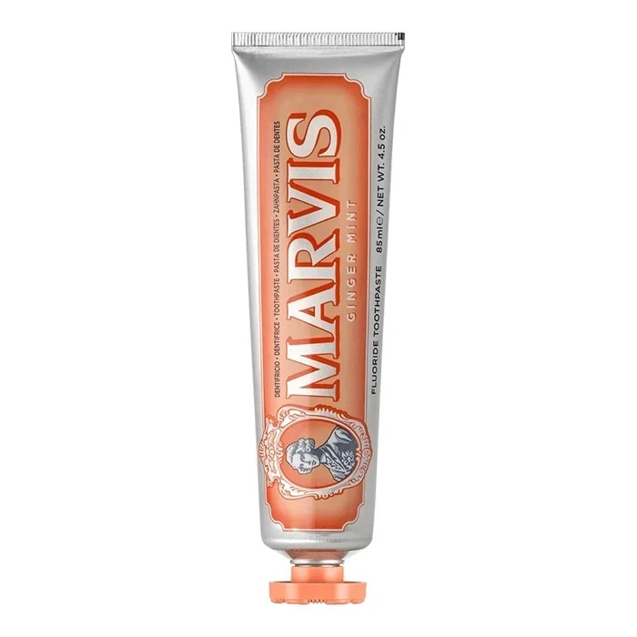 85 میلی لیتر خمیردندان زنجبیل و نعناع مارویس Marvis Ginger Mint حاوی مواد موثر خالص و قوی برای محافظت از دندان ها در برابر پوسیدگی، رفع پلاک های باکتریایی، پاکسازی جرم های سرسخت و تازگی بخشی دهان می باشد. خمیردندان مارویس دارای طراحی لوکس و طعم ادویه ای انرژی بخش زنجبیل نارنجی و خنک کننده نعنایی برای ماندگاری طولانی مدت احساس راحتی دهان و سبکی تنفس است. این خمیردندان همچنین حاوی فلوراید 0.2 درصد برای محافظت در برابر پوسیدگی و دارای بافت فشرده متفاوت همراه با طعم جذاب است و ترکیبی از احساسات سنتی، مترقی و جذاب را برای لذت بخش کردن برنامه روزانه محافظت از دندان فراهم می کند.